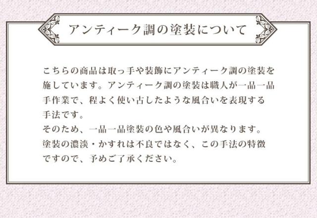 アンティーク調の塗装は職人が一品一品手作業で、程よく使い古したような風合いを表現する手法です。