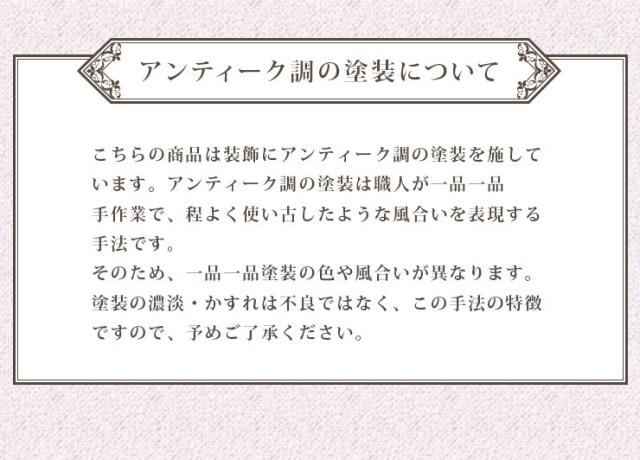 アンティーク調の塗装は職人が一品一品手作業で、程よく使い古したような風合いを表現する手法です。