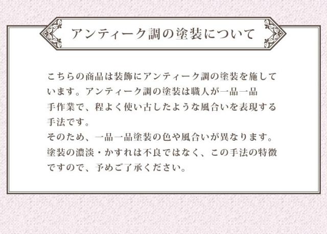 アンティーク調の塗装は職人が一品一品手作業で、程よく使い古したような風合いを表現する手法です。