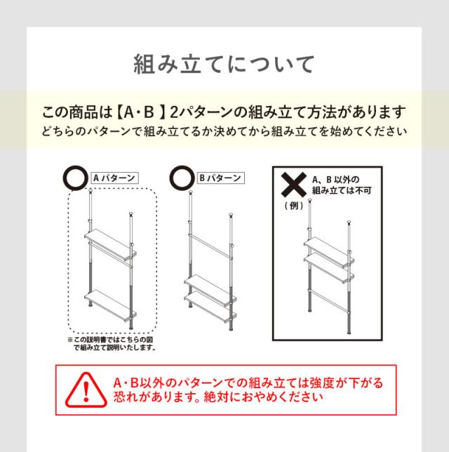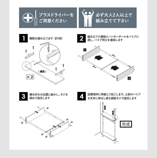 - デッドスペースを収納にするため購入しました。 結構たくさんかけられます。 一人で組み立てましたが、安全のためには二人でやったほうがいいかと。 縦ポールの塗装がかけて、怪我をしそうになったので星マイナス...