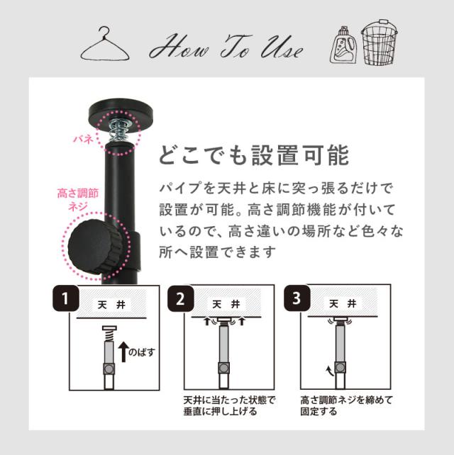 天井と床に突っ張るだけで設置できるハンガーラック。