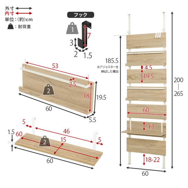 【商品サイズ(約)】幅60×奥行21.5×高さ200〜265cm