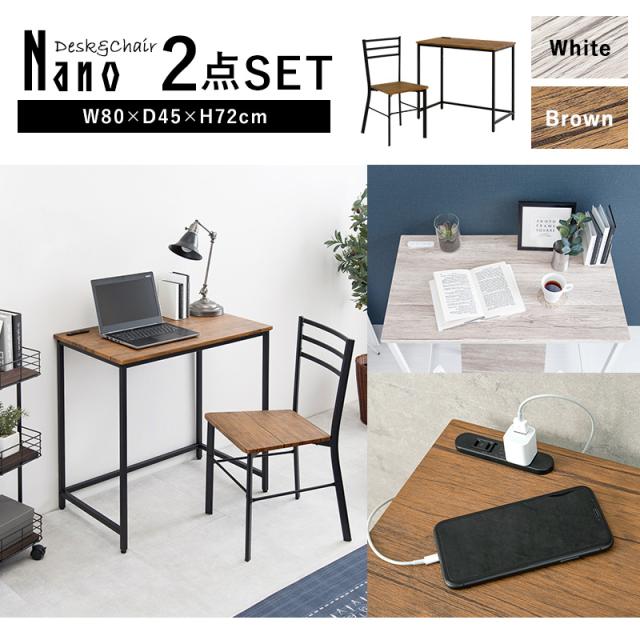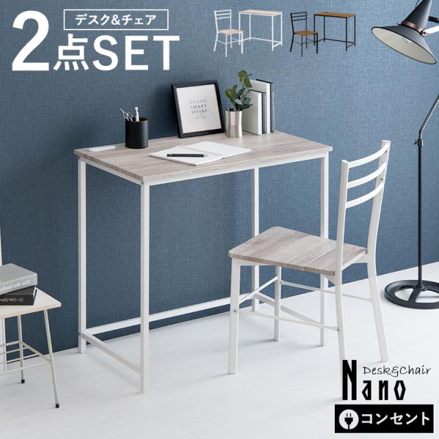 デスクチェアセット おしゃれ デスク 白 机 椅子 デスクセット パソコンデスク コンセント 木目調 デスクワーク デスク&チェア 2点セット ナノ テレワーク 仕事 可愛い 男前 子供部屋 ワンルーム Nano