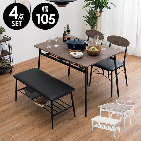 ダイニングテーブルセット 4人 4点 長方形 テーブル ヴィンテージ レザー 風 チェア ベンチ 木 コンクリート おしゃれ モダン ロの字脚 本革風 カフェ風 カジュアル セット 安い ブラウン