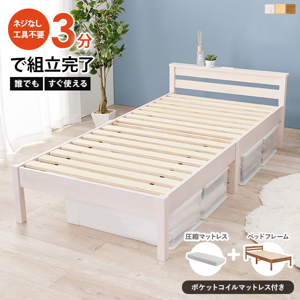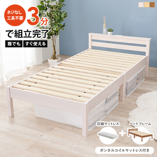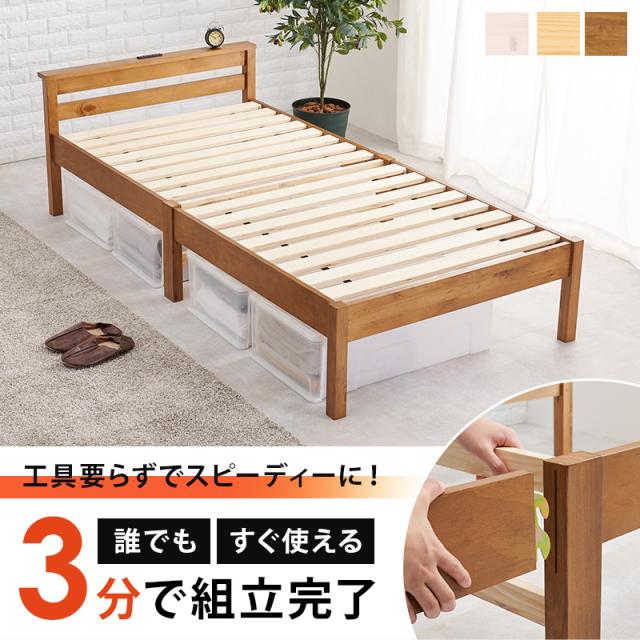ベッド 組み立て簡単 すのこ 木製ベッド ベッドフレーム シングルベッド 宮棚付き コンセント ナチュラル ホワイト 1人暮らし 耐荷重200kg NEJILESS ネジレス ベット シングル すのこ 新生活 一人暮らし 木製ベット