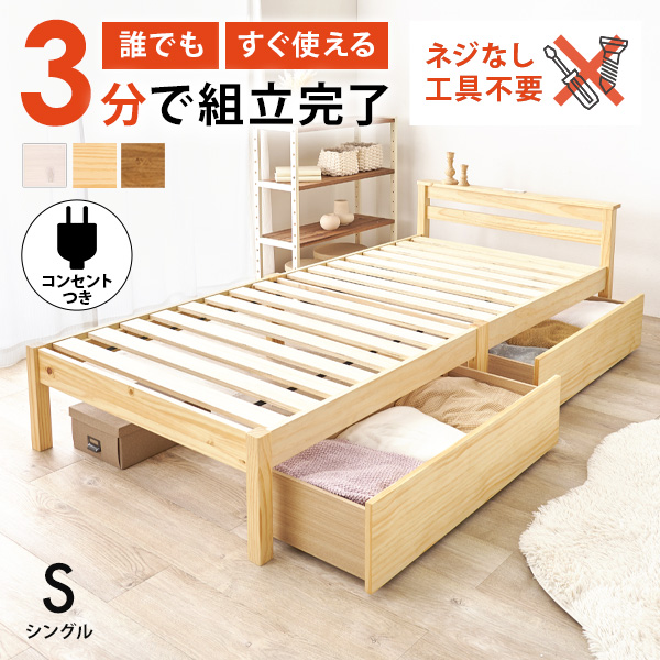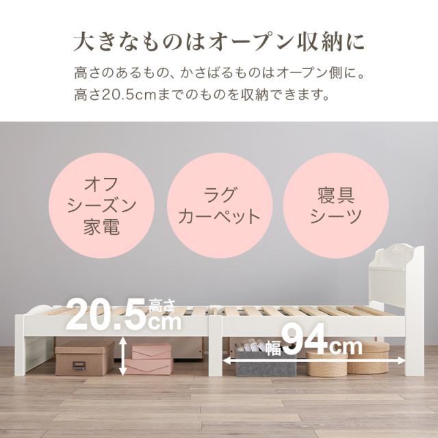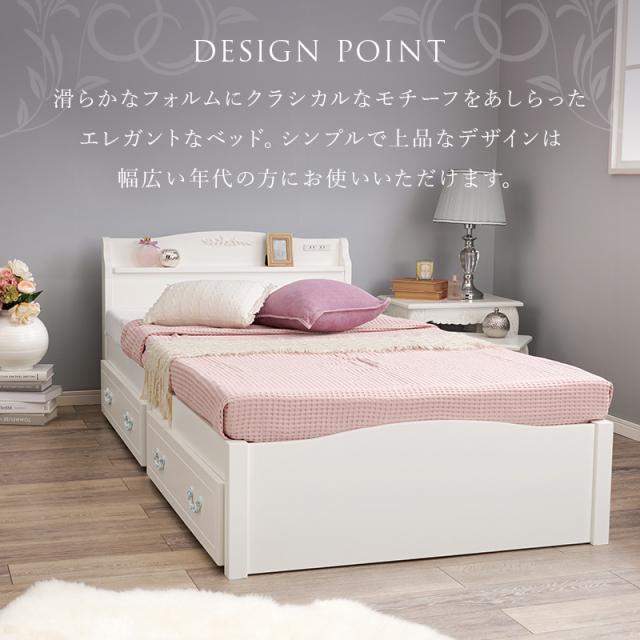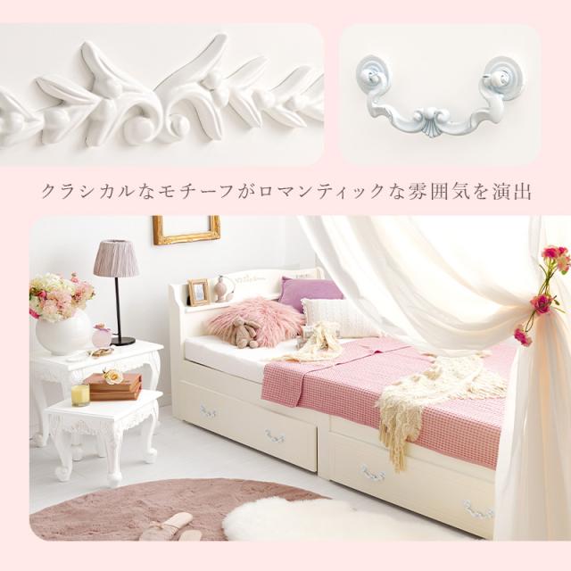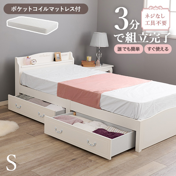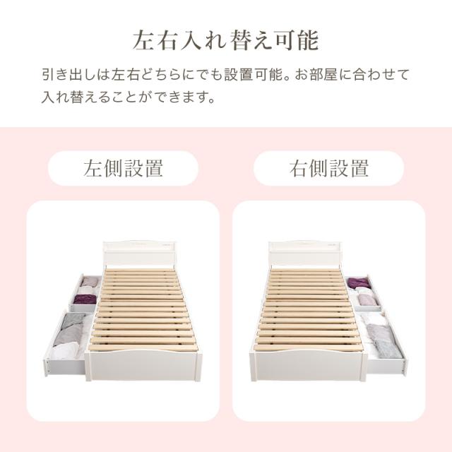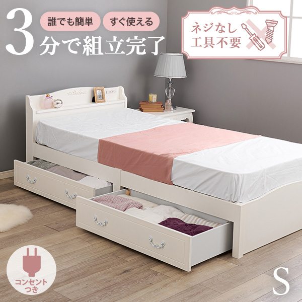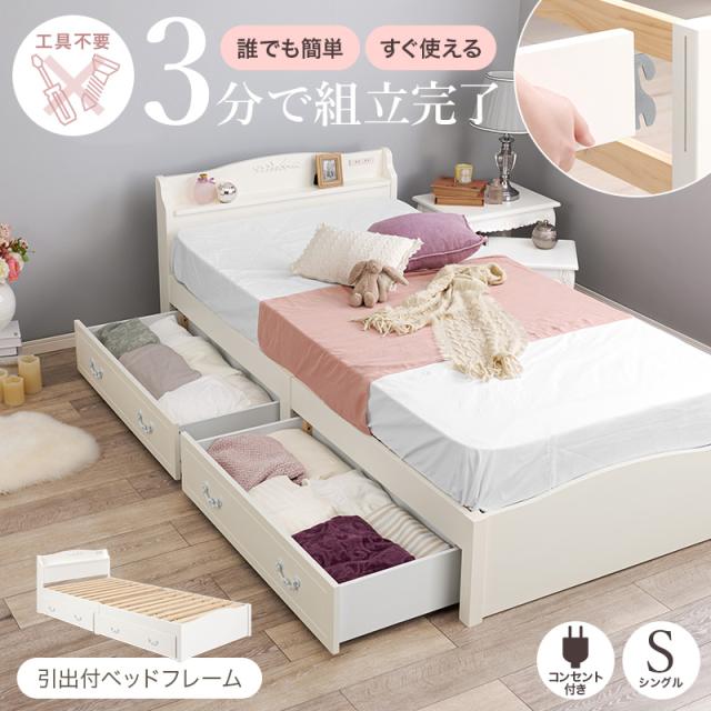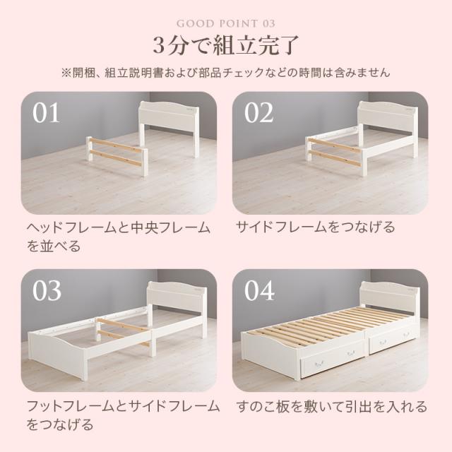 ベッドフレーム シングル すのこ 収納 ベッド 可愛い 姫系 家具 プリンセスベッド 宮付き 引き出し付き 簡単 組立 工具不要 木製 白 ネジレス コンセント付き 引出し ベッド下収納 ベット 宮棚 おしゃれ