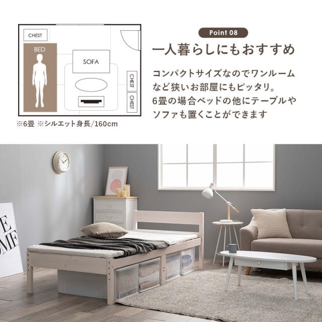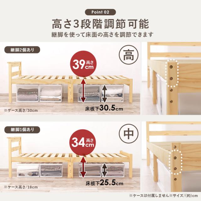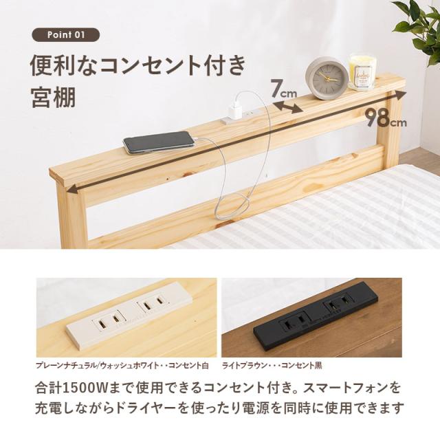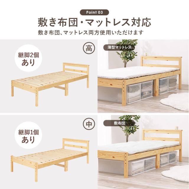 高さが3段階調節できるので、収納力もバッチリ。2口コンセントが備わった宮棚付きで、スマートフォンの充電やちょっとした小物置きに使えます。敷き布団もOKなのでお手持ちの布団に合わせてお使いいただけます。