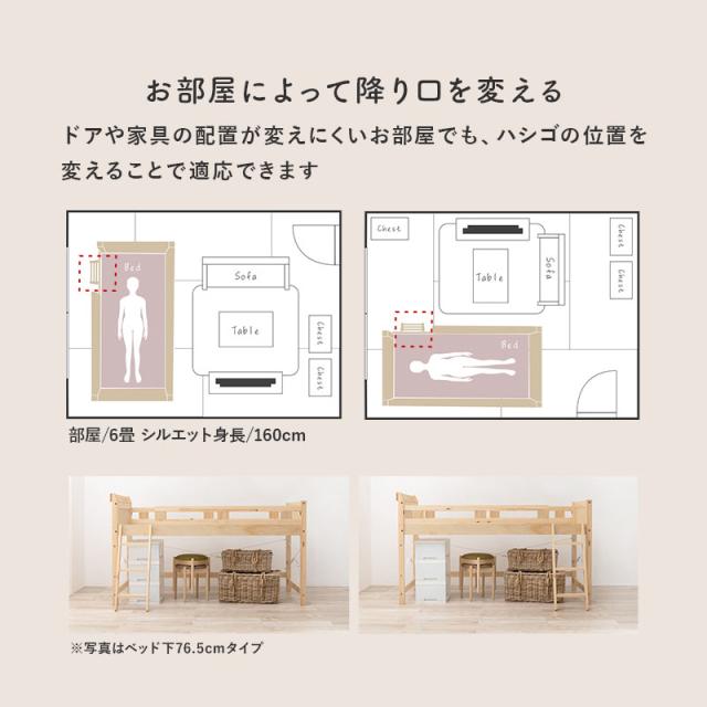 便利な2口コンセント付き宮棚と、コートや洋服をかけられるフック付き。ハシゴの位置は4方向に変えられるのでお部屋に合わせて設置可能。