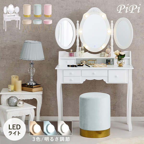 女優ミラー ドレッサー LEDライト 女優ミラー付きドレッサー 女優ライト ライト付き 調光 収納 引出し 椅子 三面鏡 可愛い おしゃれ ピピ 女優ミラー ドレッサー LED ライト 3面鏡 椅子 セット