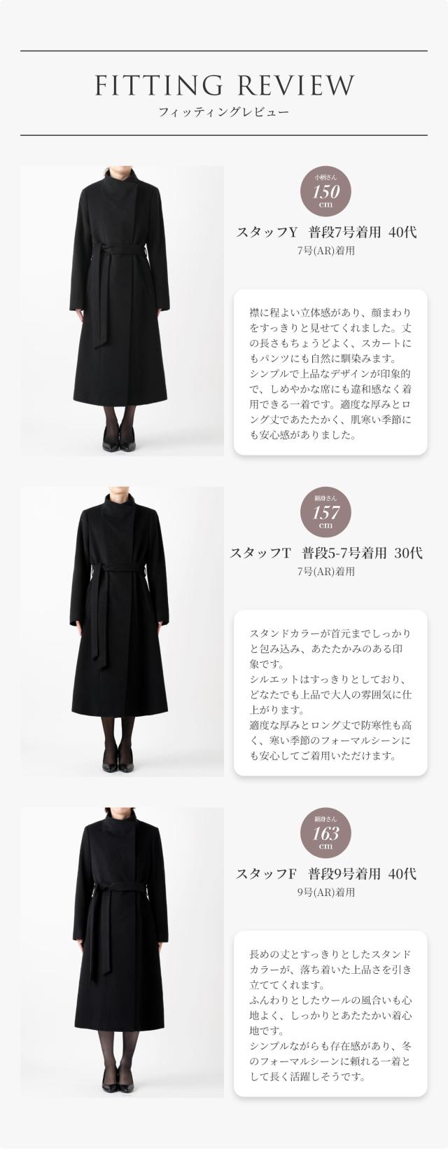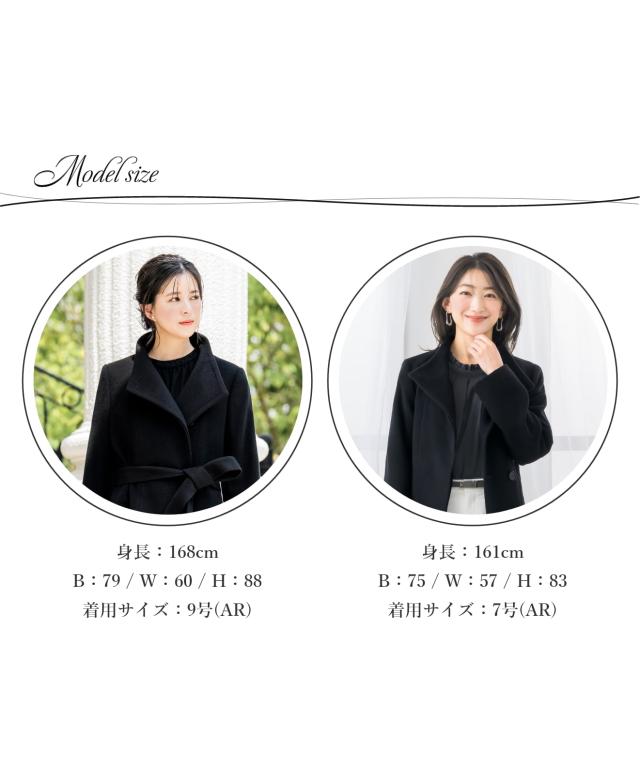 | 上質なウール100%を贅沢に使用した、暖かく着心地の良いコート。 しっかりとした総裏仕立てで保温性に優れ、秋冬のブラックフォーマルに最適です。 ボタンが表に出ない比翼仕立てが、装いに一層の品格をプラス。 スタンドカラーが首元まで包み込み、冷たい風をしっかりと防ぎます。 付属のリボンベルトはウエストを美しく引き立て、気分やシーンに合わせたアレンジが可能です。 パンツやワンピースともバランスよく合わせられる上品な丈感で、幅広い年代の方におすすめ。 冠婚葬祭などのフォーマルシーンはもちろん、通勤やデイリーにも活躍します。 シンプルで洗練されたデザインがあらゆるシーンに馴染む、 一着あると安心の万能ウールコートです。 | |
