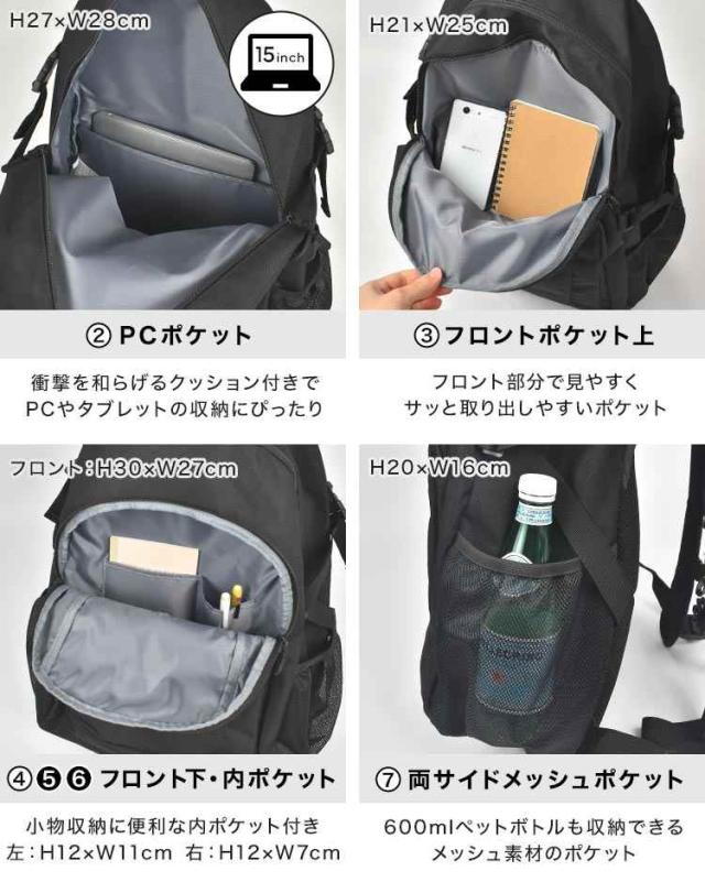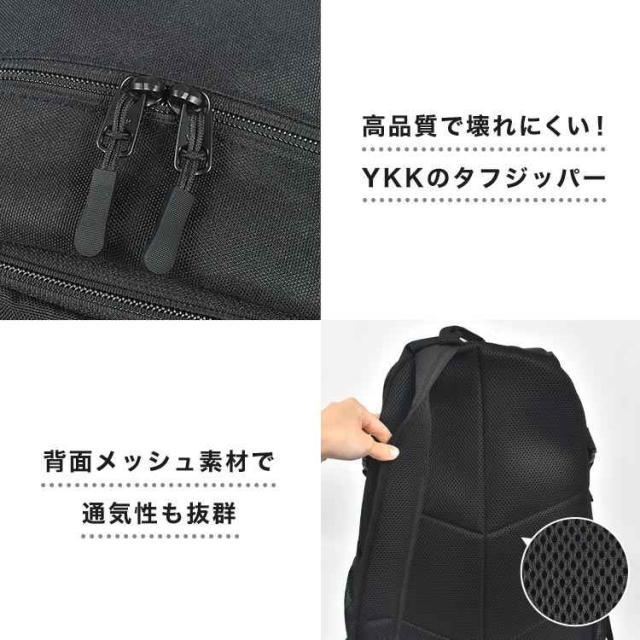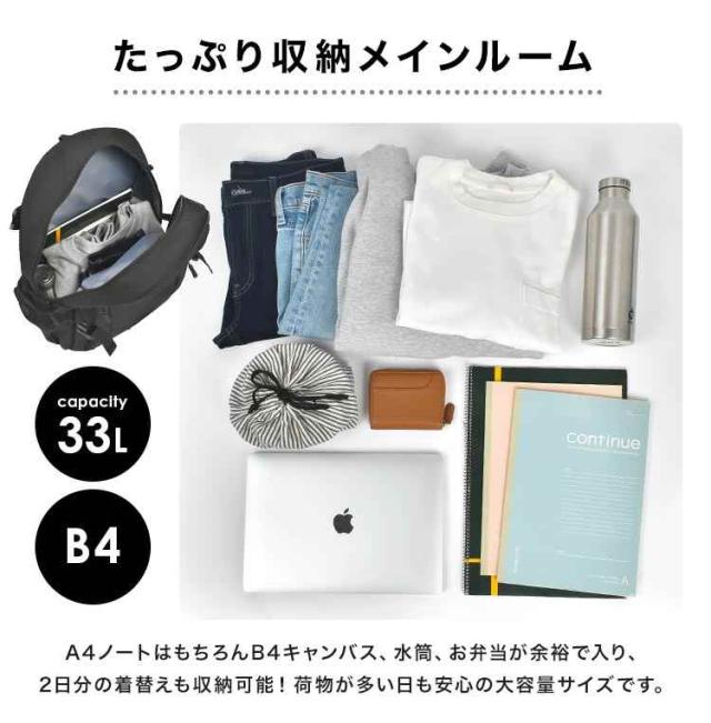 33Lの大容量でB4サイズも楽々収納可能。インナーにはPCを持ち運ぶ際などに安心なクッションポケットなど豊富なポケットに、丈夫なYKKファスナーで機能性にも優れています。背面とショルダーの体に触れる部分にはメッシュ生地を使用。 蒸れを防ぎ、快適な背負い心地。さらにチェストストラップで肩への負担も軽減します。男女問わず、誰でも使いやすいデザインとサイズ感が魅力です。