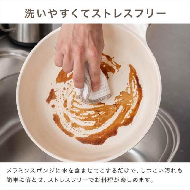 しつこい汚れもメラミンスポンジに水を含ませてこするだけで簡単に落とせ、洗い物の手間が減り、ストレスフリーでお料理が楽しめます。