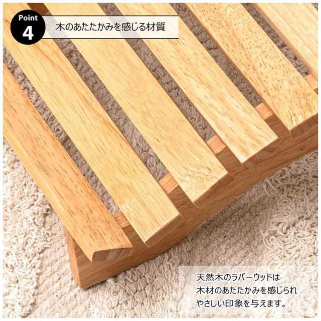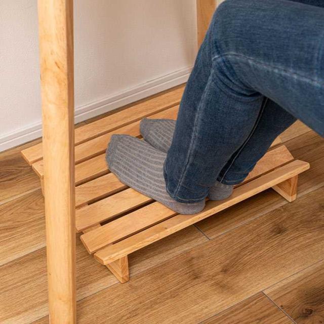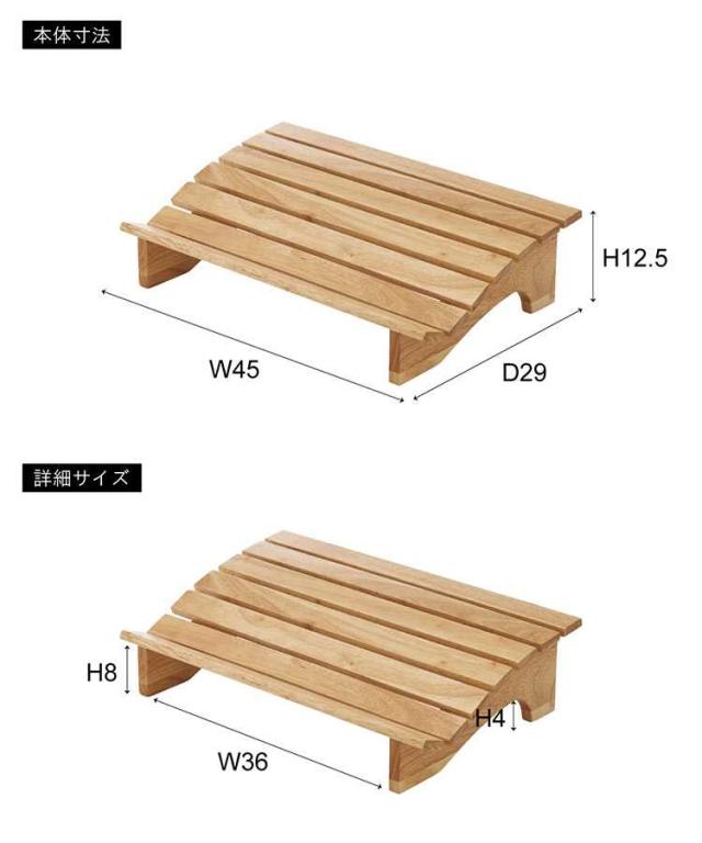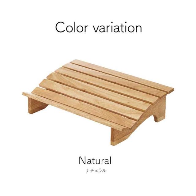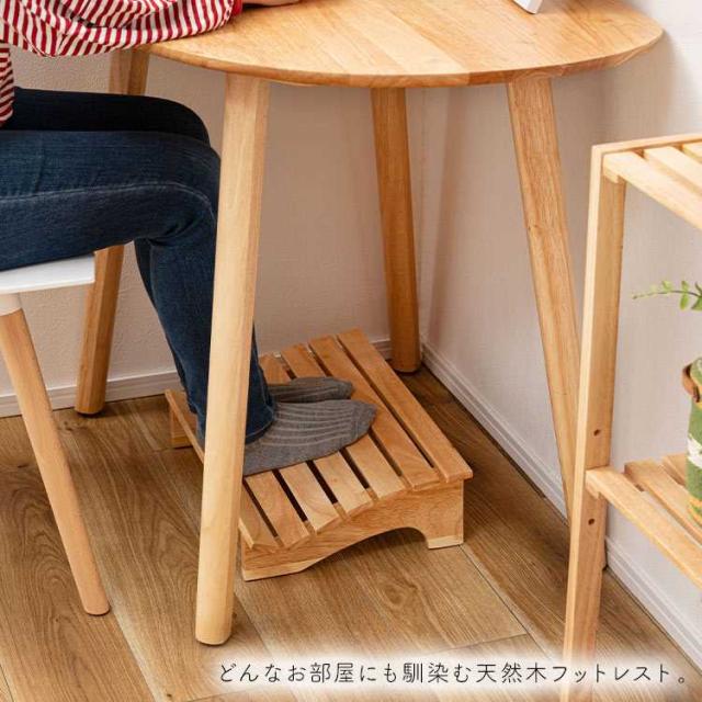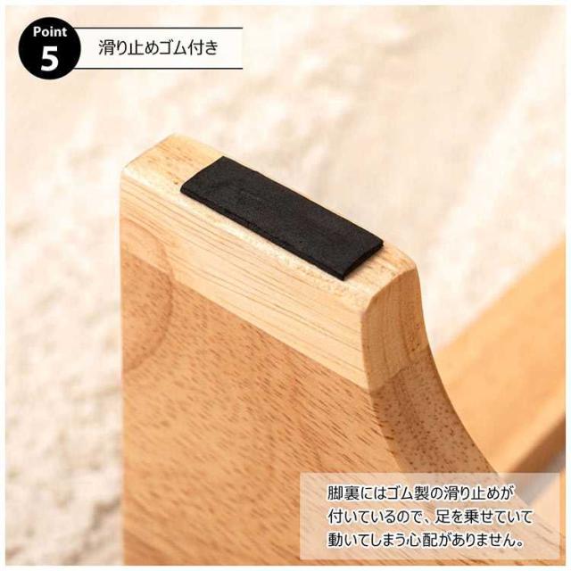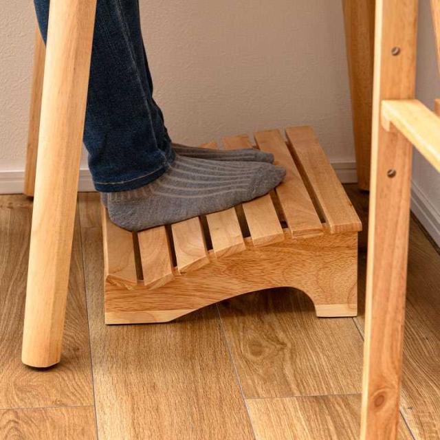 天然木(ラバーウッド)を使用したフットレスト(足置き)。かかとがフィットするように設計されているので、足の位置を高くして足首を自然な角度にすることで、疲れにくくなると言われています。「デスクワーク」「リモートワーク」などの長時間の使用におすすめ。足の位置を高くして、足首が自然な角度になる事で、長時間座っても疲れにくくなります。天然木を使用しているので、素足で使っても気持ちよく使えます。完成品なので面倒な組立作業がなく、届いてすぐに使えます。天然木のあたたかみと優しさを感じられるラバーウッドを使用。脚裏にはゴム製の滑り止め付き。
