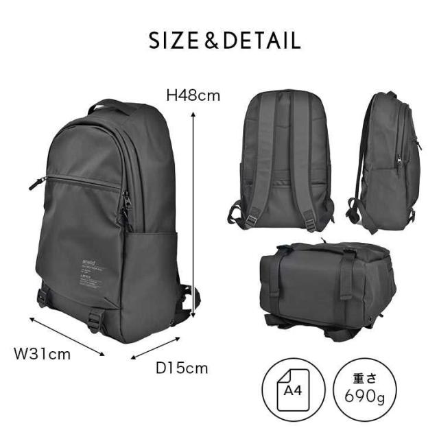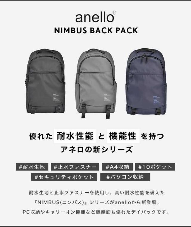 耐水生地と止水ファスナーを使用し、高い耐水性能を備えた『NIMBUS(ニンバス)』シリーズがanelloから登場。出張や旅行にちょうど良いサイズ感とユニセックスに使えるシンプルなデザイン。豊富な10個のポケットにPC収納やキャリーオン機能など機能面も優れたデイパックです。