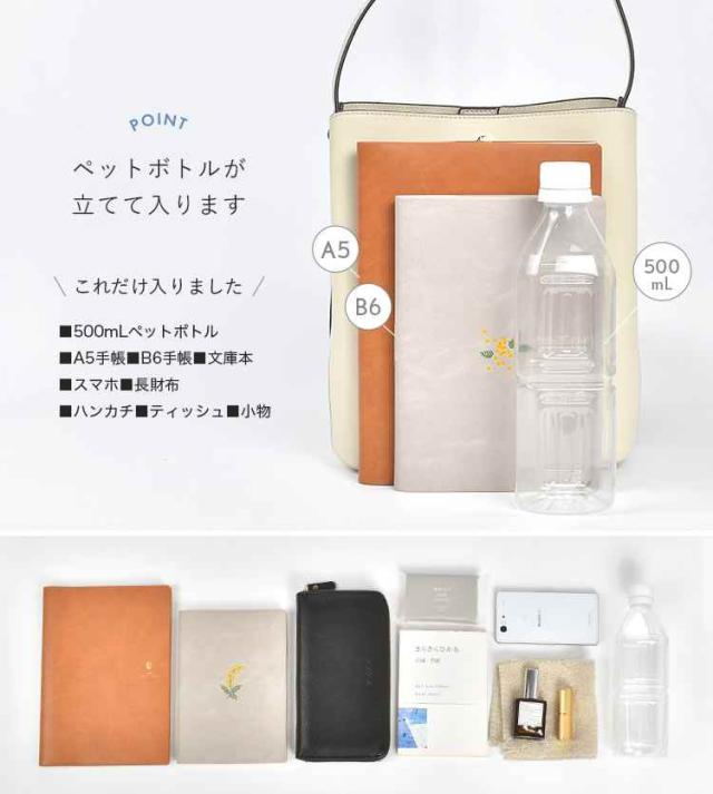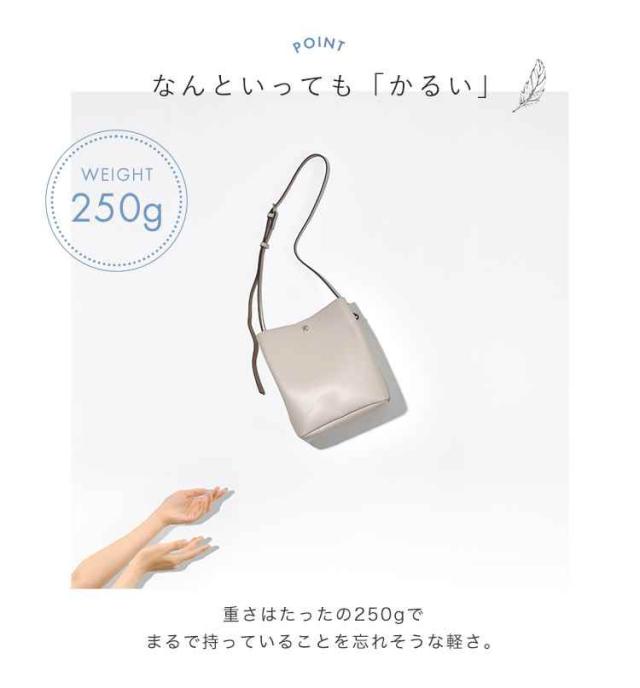 重さはたったの250g。まるで持っているのを忘れそうな軽さです。コンパクトだけど長財布や500m Lのペットボトルも縦に入り、収納力もあります。あおり型でさっと取り出したいものはメインポケットの前後のポケットを使うと便利です。