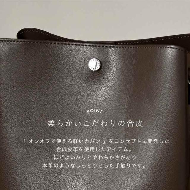 「 オンオフで使える軽いカバン 」をコンセプトに開発した合成皮革を使用したアイテム。ほどよいハリとやわらかさがあり、本革のようなしっとりとした手触りです。