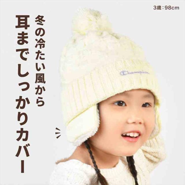 リボンジャガードがとってもかわいい!Championの耳当て付きキッズニット帽。お顔が当たる内側部分は毛足の長いふわふわしたボア生地で被り心地も見た目もあたたか♪耳当て付きで真冬の通園通学やおでかけにもぴったり!保育園児から小学校低学年におすすめです♪