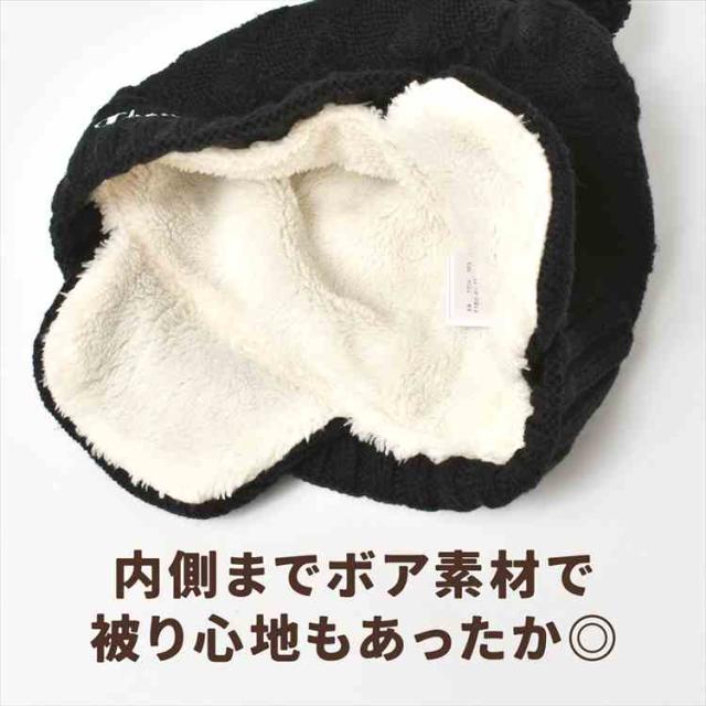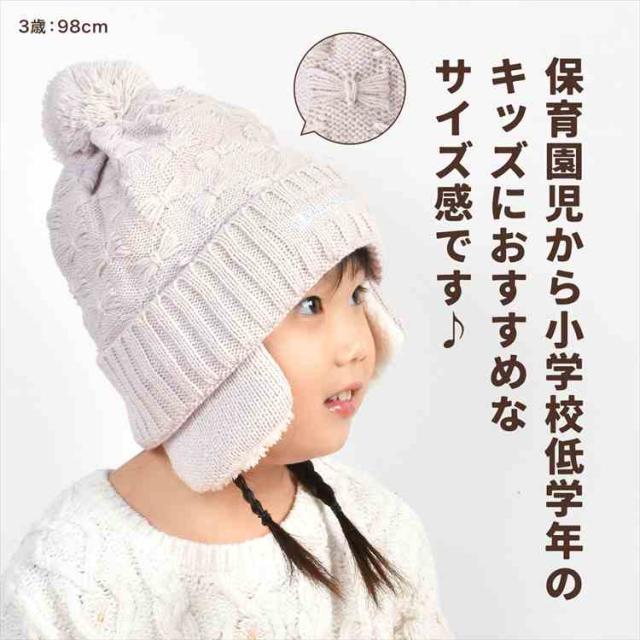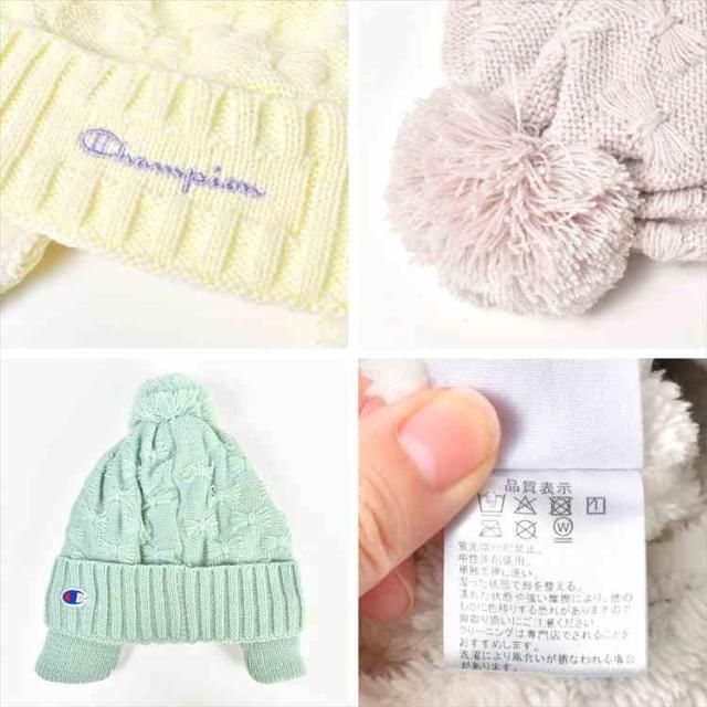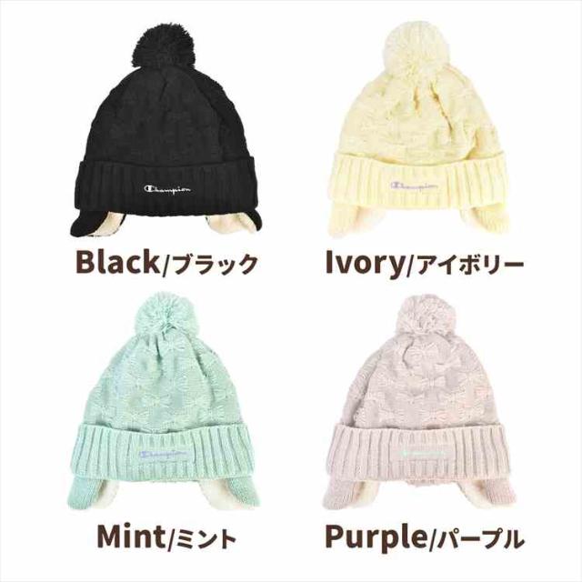 キッズ ニット帽 耳あて チャンピオン champion ポンポン 耳当て リボン かわいい ブラック アイボリー ミント ラベンダー パープル 53 54 55 cm 女の子 裏ボア 耳まで隠れる 子供 子ども おしゃれ 通園 通学 クリスマス ギフト 誕生日 プレゼント 園児 小学生 防寒 黒 白