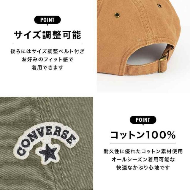 キャップ CONVERSE コンバース レディース メンズ おしゃれ ブランド 帽子 111312702 UVケア 日よけ 通年 春夏秋冬 フェルトワッペン ロゴ 大人っぽい かわいい 男女兼用 カジュアル コットン 綿100% キャンバス生地 サイズ調整可能 アウトドア 定番 緑 キャメル オリーブ
