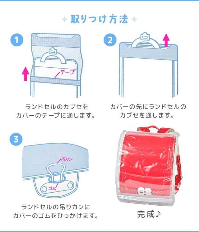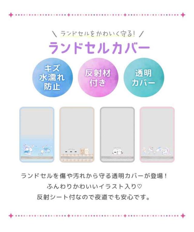 傷や汚れから守るランドセルカバー!透明なのでランドセルのデザインを崩さず大切な欄でセルを可愛くカバーできます♪反射テープ付きなので暗くなった夜道でも車のライトで光って安心◎人気のオバケーヌやユニコーン、くまやしまえながのふんわりかわいいキャラクターのデザイン。新学期や入学準備、入学祝いのギフトとしてもおすすめです。