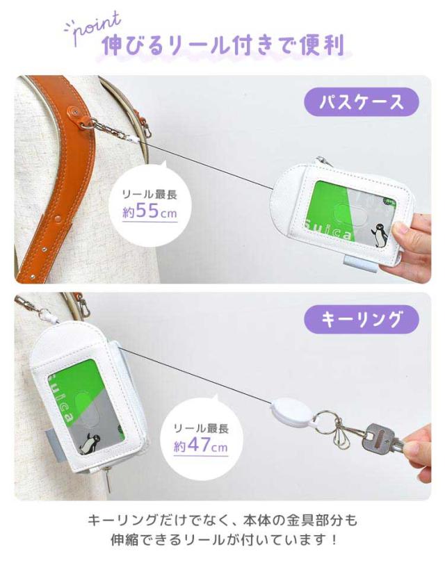 ランドセルやバッグにつけたまま使えます♪ファスナーポケットに鍵を収納できて、背面のカードポケットに定期券を収納できます。伸びるリール付きなので、お子様でもサッと取り出せます。暗いところで光る反射タグが付いているので夜道も安心です。入学祝いやギフト、プレゼントにおすすめです◎