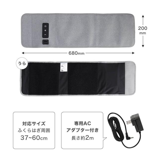 1台でふくらはぎだけでなく太ももでも使用可能な2wayタイプ。操作も簡単で、スタートは電源ボタンを押すだけであとはお任せ。太ももにしっかり巻ける大判サイズ。面ファスナーだから調節も自由自在です。