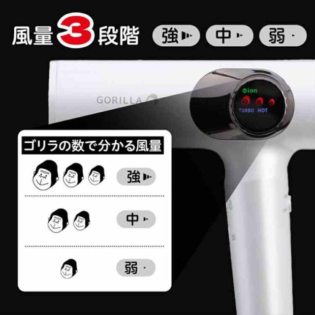 その風、まさにゴリラ級!SNSでも話題のゴリラのハイパワーシリーズに超強力モーター搭載のドライヤーが新登場。最大風速63.91m/sの大風量で髪を乾かす時間を大幅時短。さらにたっぷりマイナスイオンや手間要らずのリズムモード(冷温自動切り替え機能)でしっとりなめらかな美髪もキープ。わかりやすいゴリラ柄のLED表示や3段階の風量、温度調整など機能性も抜群です。本体は軽量で扱いやすく、フィルターを外して水洗いも可能。プレゼントにも喜ばれるアイテムです。