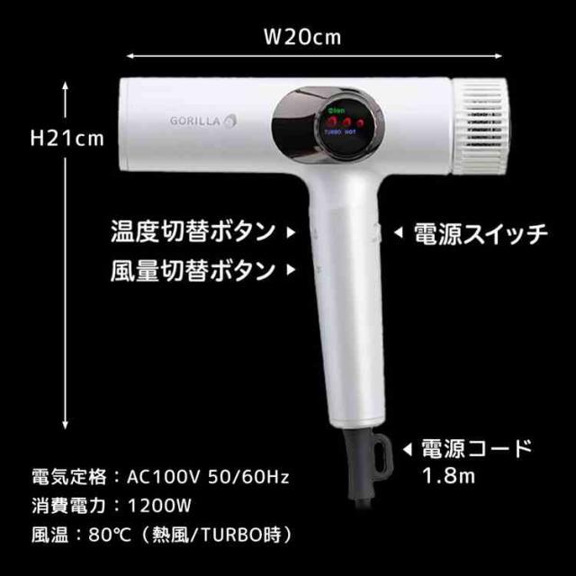 ドライヤー 大風量 ゴリラのひとふき DOSHISHA ドウシシャ 速乾 1200W マイナスイオン 軽い 軽量 コンパクト スリム 1年保証 時短 風量 最強 強い 温風 冷風 交互 温度調整 低温 高温 GRD-2501 ヘアドライヤー ヘアケア 美容家電 誕生日 クリスマス プレゼント ギフト