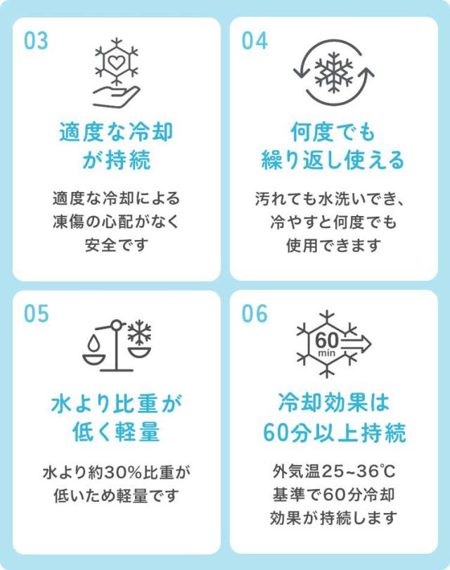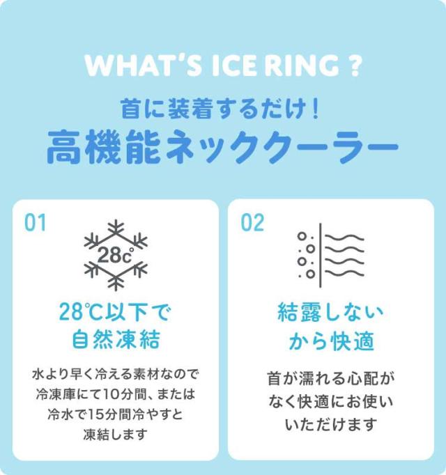 Details アイスリング L 通勤通学や外での家事、農作業やピクニック、アウトドア時などなど使えるシーンがいっぱいの繰り返し使えるアイスリング L! 「ICERING_アイスリング_」は28℃以下で自然に凍結し、屋外屋内どこでも繰り返しお使いいただけるアイテムです。首元を冷やすことで、全身の熱をクールダウンさせてくれるICE RING_。直接肌につけることで身体の熱を吸収し、心地よくクールダウン。身体にこもった熱を逃がします。 ◆ 28°C以下で自然凍結 ◆ 結露しないから快適 ◆ 適度な冷却が持続 ◆ 何度でも繰り返し使える 品番 A2Y4033 サイズ 首周り:約37cm 重量 約125g 素材 外側:TPU 内容物:Temperture Control Ingrediment(温度制御成分) 対象年齢 3歳〜 生産国 中国 ご注意 ※外側の素材は気体を通す性質があります。内容物のごくわずかな微粒子が通過し、気温の低さなどから結晶化され表面に白い粉が付着していることがあります。温まると溶けて消失しますので、ご使用に影響はございません。水洗いした後、柔らかい布で拭いてご使用ください。 ※表記サイズより、多少の誤差があることがございます。 ※商品の画像はできる限り実物に近づけるよう配慮しておりますが、お使いのモニターやご覧になる環境によりましてはカラーの見え方に差が出る場合がございます。ご了承くださいませ。 関連キーワード キャンプ フェス ライブ コンサート テニス サッカー 野球 ジョギング ランニング バスケ 陸上 マラソン バドミントン 卓球 バレーボール 部活 クラブ ペット 犬 散歩 スクール 家事 キッチン 料理 仕事 保冷剤 ラベンダー クリーム アイボリー 総柄 くだもの柄 果物 ミント イエロー 黄色 10代 20代 30代 40代 50代 60代 70代 80代 通勤 おじいちゃん おばあちゃん 農作業 工事 現場仕事 子ども 子供 こども キッズ ジュニア 女子 女の子 女性 ガールズ レディース 男子 男の子 男性 大人 ボーイズ メンズ 誕生日 プレゼント プチ ミニ ギフト お祝い お返し 粗品 景品 送別会 イベント 母の日 父の日 クリスマス クリスマスプレゼント おしゃれ オシャレ お洒落 かわいい 可愛い カワイイ シンプル かっこいい カッコいい カッコイイ | ||||||||||