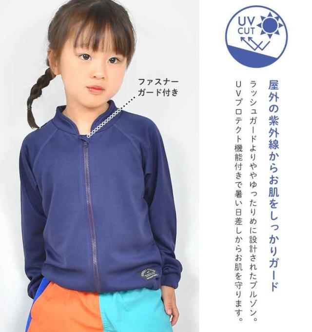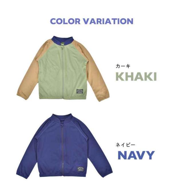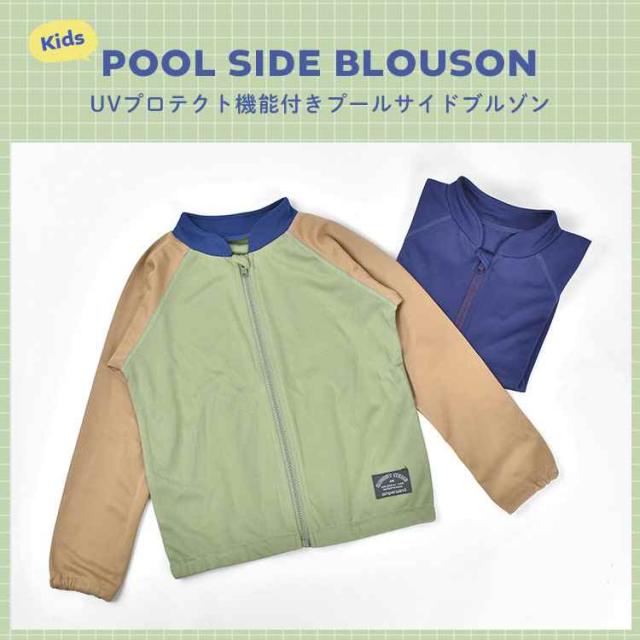UVプロテクト機能付きのプールサイドブルゾン。屋外の視線からお肌をしっかりガードします。男の子も女の子も着用しやすいシンプルデザイン。前開きのファスナータイプでサッと羽織れば日焼け止めを塗り直す手間もなく楽ちん♪さらっとした手触りの生地で伸縮性もバッチリ◎カーキとネイビーの2色展開です。