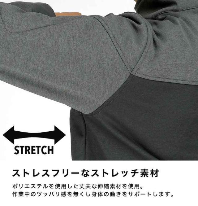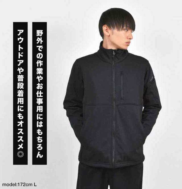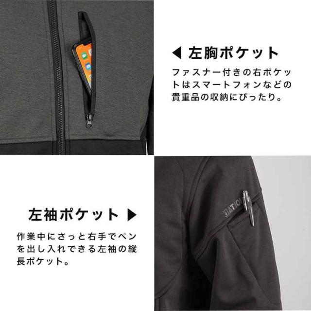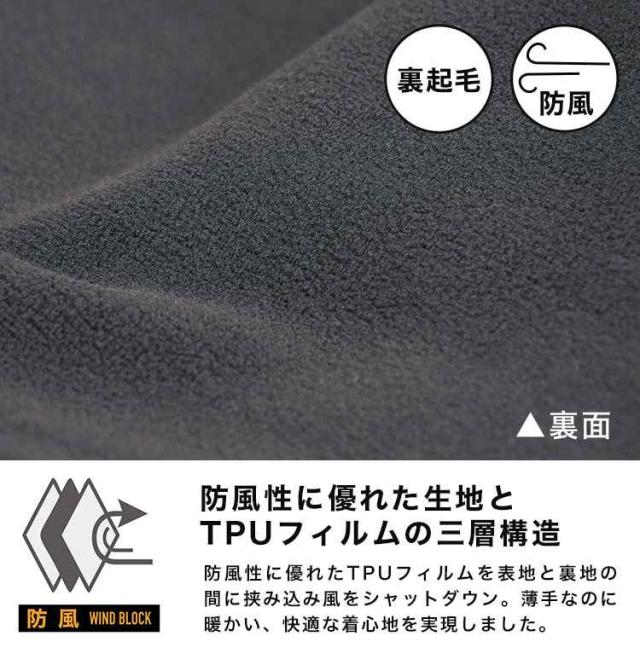 防風性能の高い表地と暖かい起毛裏地の間に更にTPUフィルムを挟む三層構造で寒風をブロック。薄さと暖かさを両立した防寒ジャケットです。中綿が入っていないためかさばらずシルエットも細身なので、秋口や春先のアウターとしてはもちろん、真冬のミドルレイヤーとしても活躍。動きを妨げないストレッチ素材やファスナー付き胸ポケット、左袖のペン用ポケットなど作業着としての機能性も◎