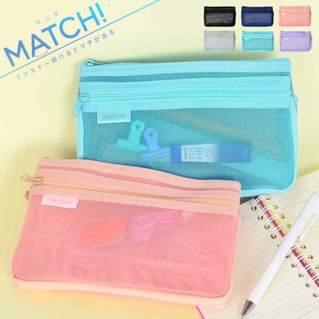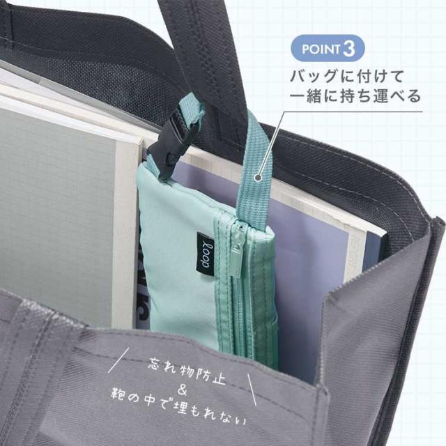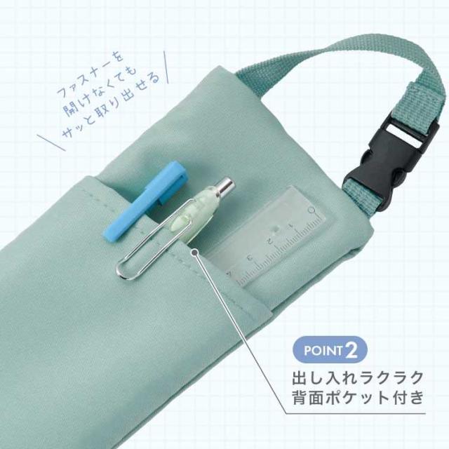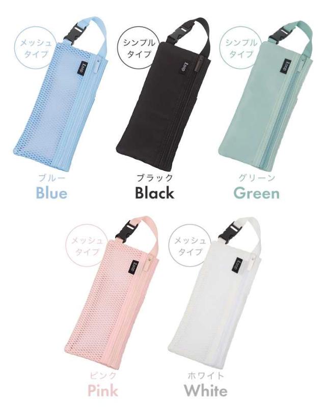 持ち手付きで持ち運びに便利なペンケース。ワンタッチバックル付きの持ち手はフックにかけたりバッグに取り付けたりできます。カバンの持ち手に取り付けておけば荷物に埋もれず忘れ物の防止にも◎ファスナーを開けなくてもサッと取り出せる背面ポケットも付いています。中身が見えるメッシュタイプとシンプルタイプがあります。