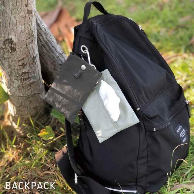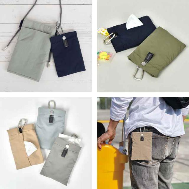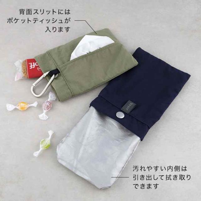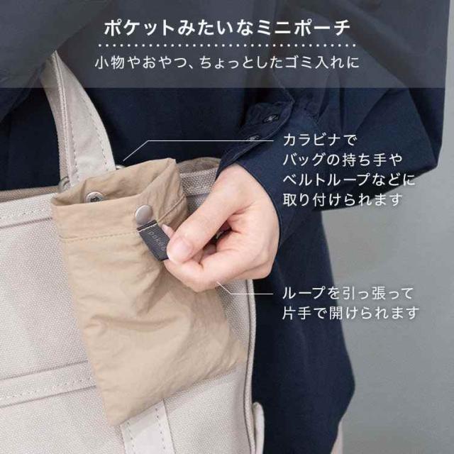ポケットのように使えるミニポーチ。小物が入るポケットとポケットティッシュ入れが背中合わせになったポーチです。カラビナ付きでバッグの持ち手やベルトループなど、どこにでも取り付けられます。正面のループを引っ張ることでスナップボタンが外れるので片手で開けることができます。小物や小さなおやつはもちろん、エコバッグや使用後のティッシュ、レシートなどのちょっとしたごみも入れられます。汚れやすい内側は引き出して拭き取りできるのも◎