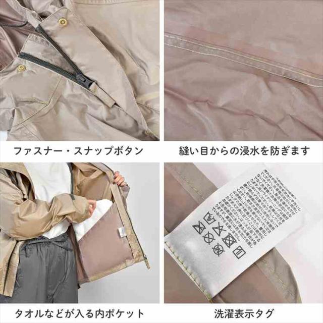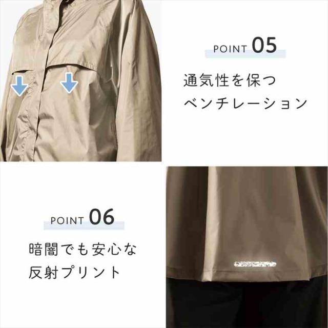 通気性を保つベンチレーション、暗闇でも安心の反射材、鍵などにちょうどいいミニポケット、自転車運転時に裾の絞りを調節できるボタン、収納用巾着袋など細やかな機能も充実。