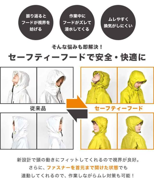 安全性に特化した新設計セーフティーフードを採用した、ヘルメット対応の高機能な上下セットのレインウェア。