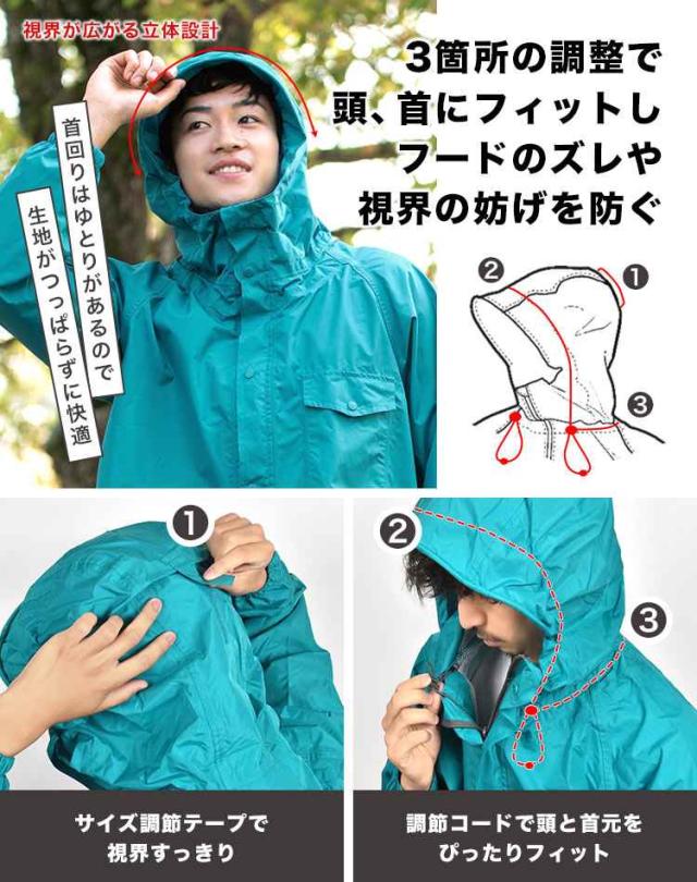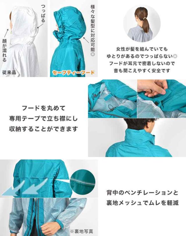 レインウェアといえば、「フードがズレる」「フードが視界を遮る」「ムレを我慢しなくちゃいけない」など様々な悩みがあります。 新設計のセーフティーフードならば、しっかり頭にフィットしズレてくる心配もなく上下左右視界も良好◎