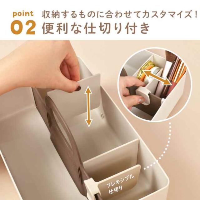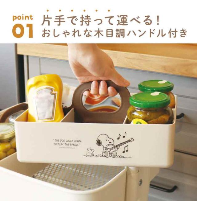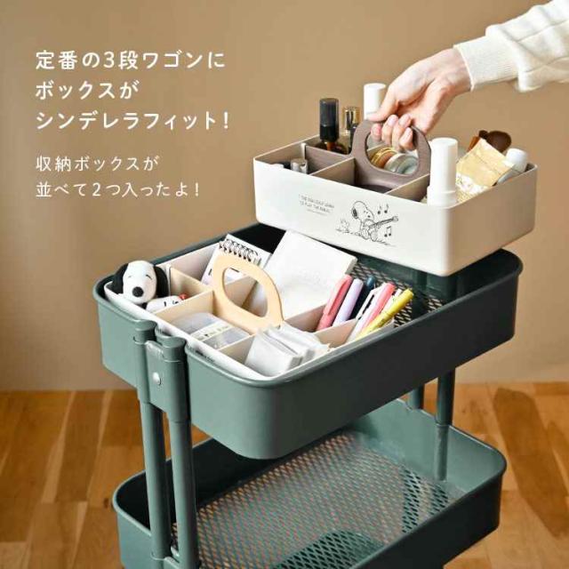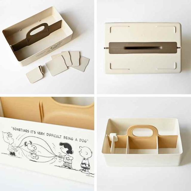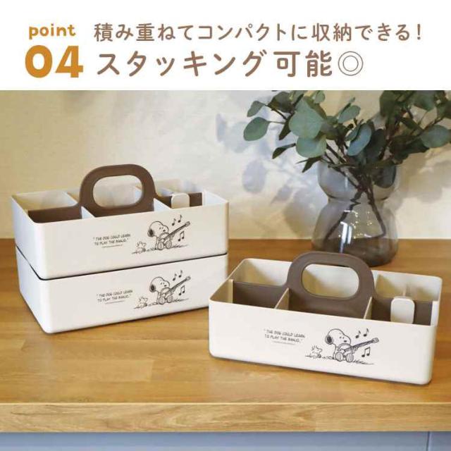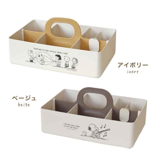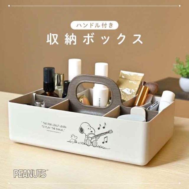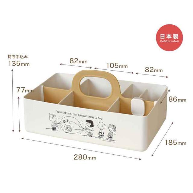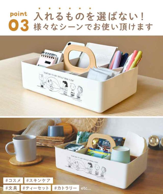 持ち手がついたスヌーピーの収納ケースです。 化粧品や文房具、アメニティグッズなど部屋の中で持ち運びたいときに便利◎ 仕切りは取り外し可能◎収納する物のサイズに合わせてご使用いただけます。 専用仕切りとは別で仕切れるオプション付き!