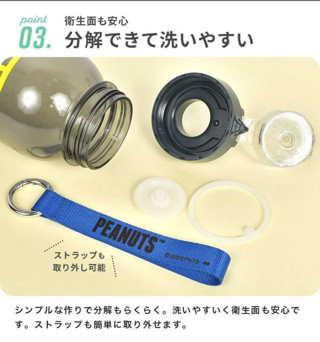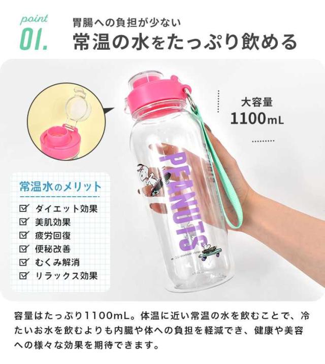 スヌーピーのイラストが可愛いドリンクボトル。大容量の1.1Lで健康や美容にいい常温水がたっぷり飲めます。軽くて使いやすいクリアタイプで透明感がおしゃれ♪ジムやヨガ、ウォーキング時におすすめです。ストラップ付きで持ち運びやすく、通勤、通学にも◎シンプルな作りなので分解しやすくお手入れも簡単です。