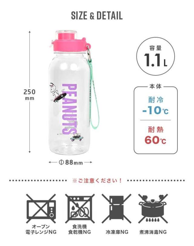水筒 クリアボトル スヌーピー ドリンクボトル 直飲み 1リットル 大容量 SNOOPY ウォーターボトル 透明 クリア かわいい おしゃれ 女子 大人 子供 キャラクター グッズ PEANUTS 1.1L 軽量 ストラップ シンプル 常温 プラスチック ボトル スポーツ ヨガ 運動 部活 アウトドア