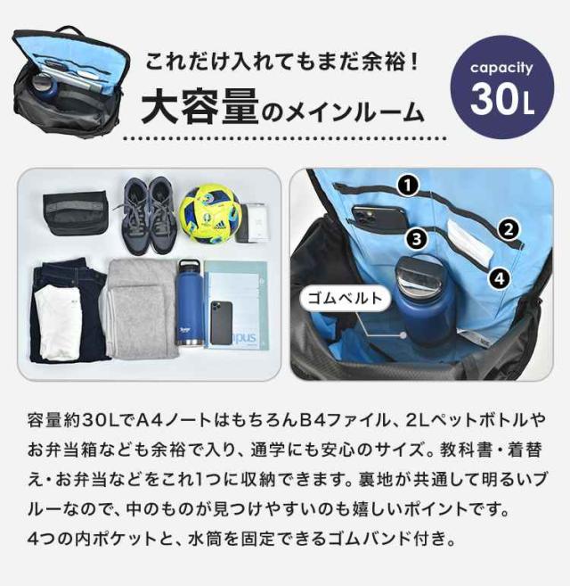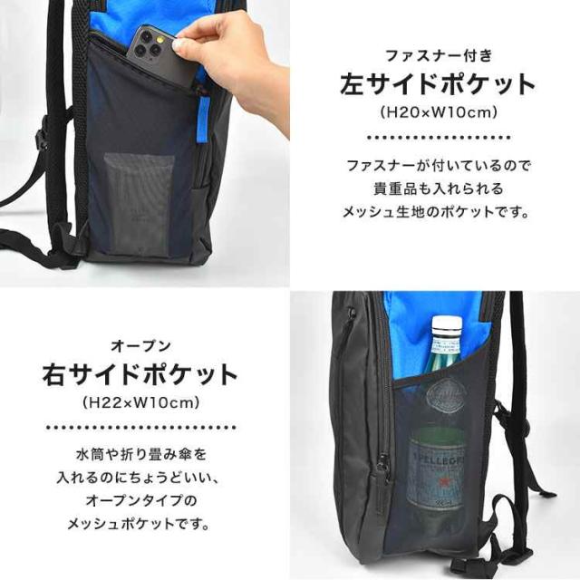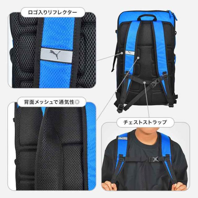 人気ブランド『PUMA』から、ボールやシューズ、ウェアを分けて入れられる外付けメッシュポケットが付いたスポーツリュックが登場。部活、試合、遠征など様々なスポーツシーンで必要な荷物を一つにまとめて持ち運べます。メッシュポケットは不要なときは取り外しできるので、通常のリュックしても様々なシーンで使用いただけます。 約30Lの大容量でA4ノートはもちろんB4ファイル、2Lペットボトルやお弁当箱なども余裕で入り、通学にも安心のサイズ。裏地が共通して明るいブルーなので、中のものが見つけやすいのも嬉しいポイントです。4つの内ポケットと、水筒を固定できるゴムバンド付き。