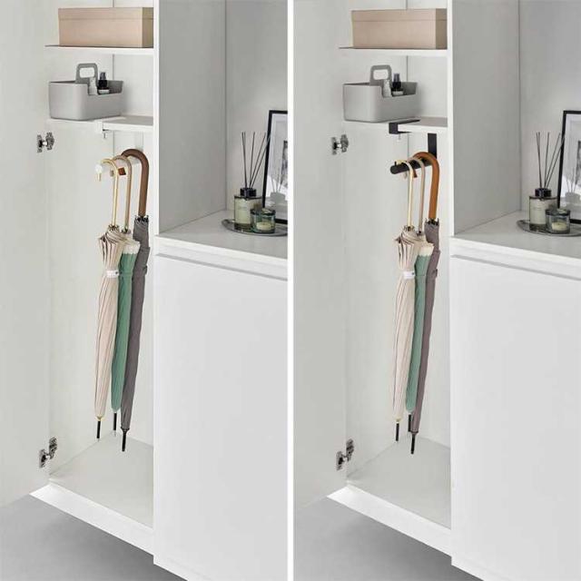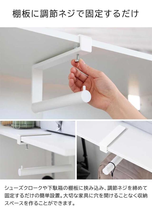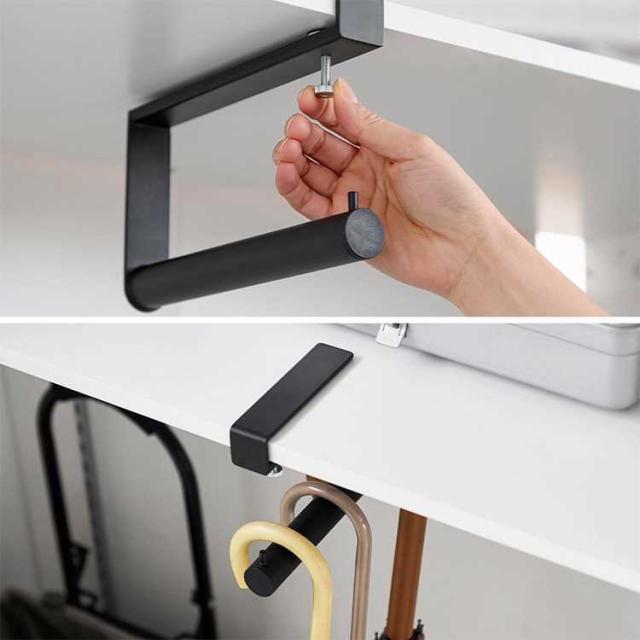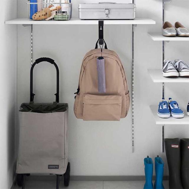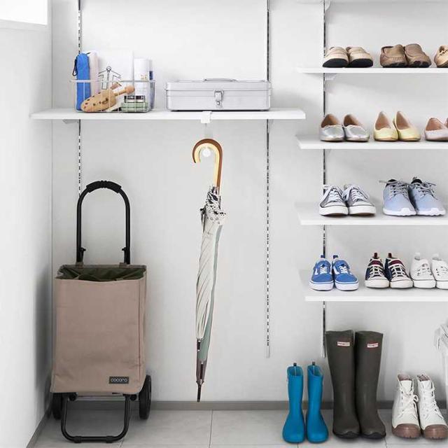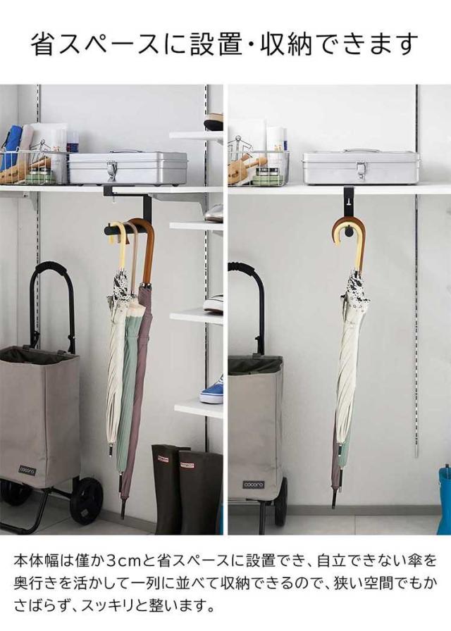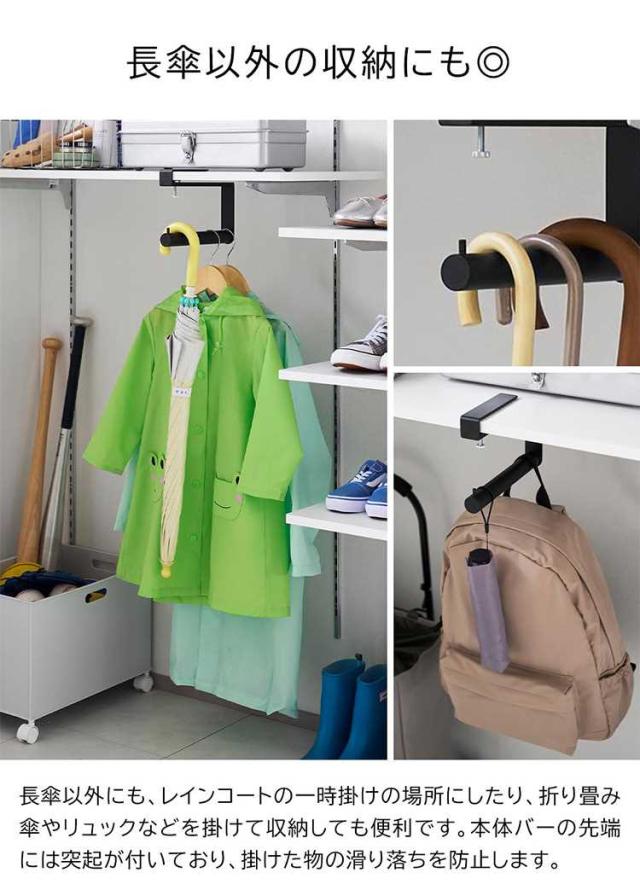 長傘をシューズクロークや下駄箱に収納して玄関をスッキリ。ハンギングタイプの傘立てです。棚板に挟み込んで調節ネジで締めるだけの簡単設置。折り畳み傘やリュックなどの収納にもおすすめです。レインコートの一時掛けとしても便利です。
