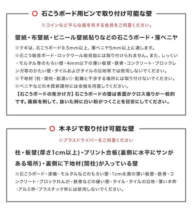 木ネジ使用時:柱・板壁(厚さ1cm以上)・プリント合板(裏側に水平にサンがある場所)・裏側に下地材(間柱)が入っている壁