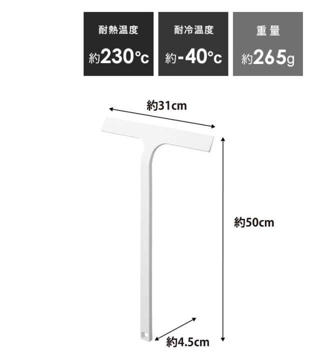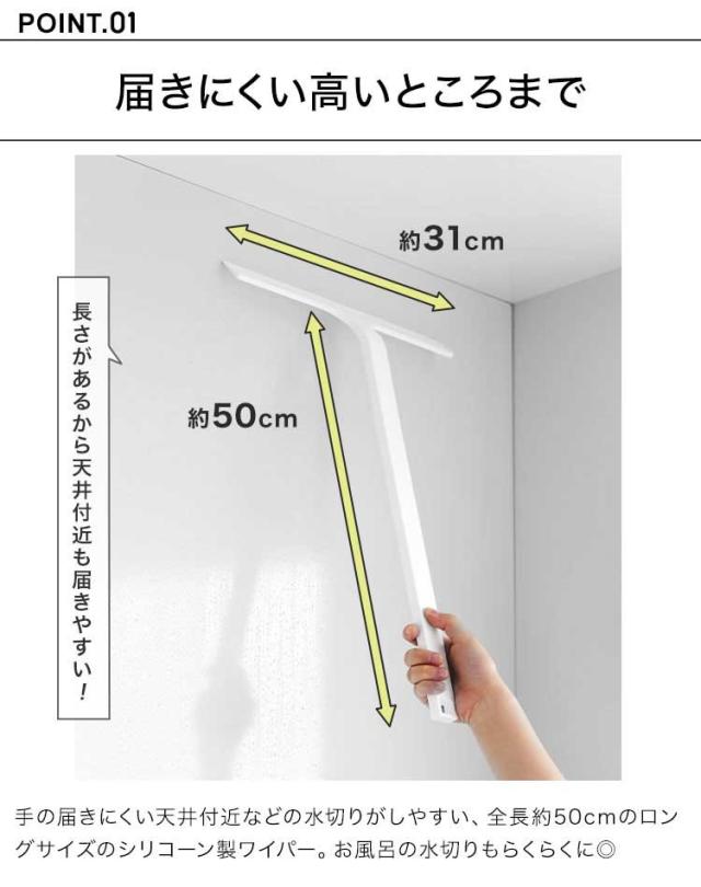 マグネットで浴室壁面に浮かせて収納できるので衛生的。持ち手が長いので天井付近も水切りしやすいワイパー!浴室の壁や鏡のカビや水垢を防ぐことができるシリコーン製の水切りワイパー。天井付近の水切りがしやすい全長約50cmのロングサイズ。ワイパーの幅が約31cmとワイドなので鏡や窓の水切りにも最適!手の届きにくい窓の水切りにも便利。フロントガラスやルーフの水切りにも。