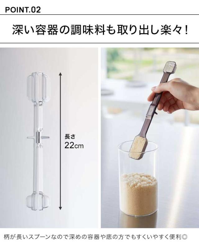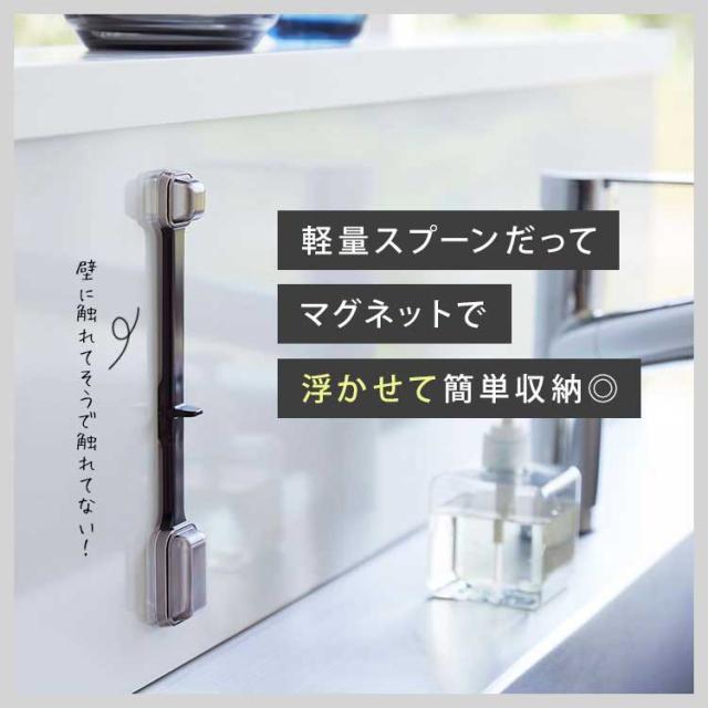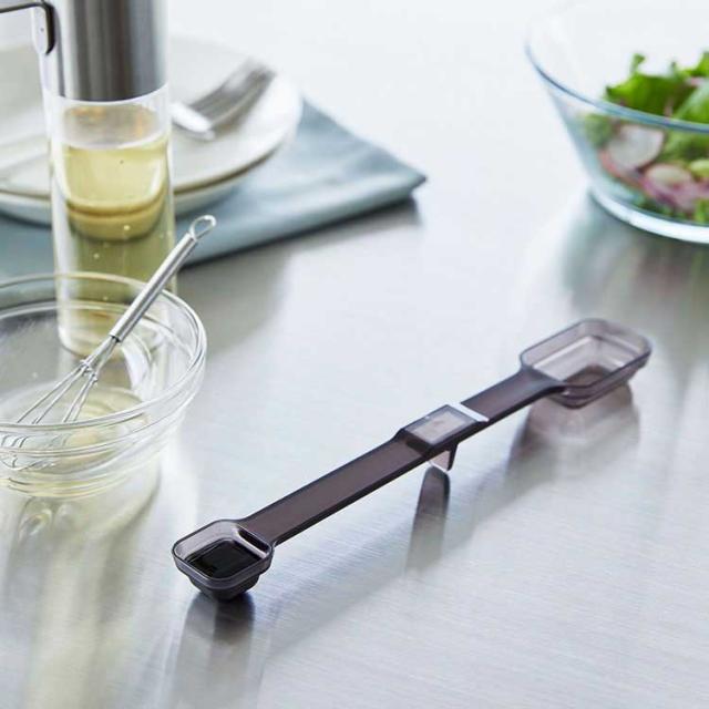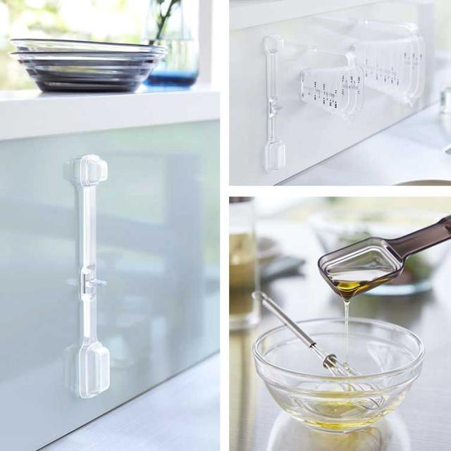 壁に浮かせて収納できる、マグネット内蔵の計量スプーン。大さじ・小さじ・大さじ1/2・小さじ1/2を、これ一本で簡単計量が可能OK!耐熱温度が100℃なので、食洗機に対応しているのも嬉しいポイントです。壁にスプーンを収納していても壁には接しないので衛生面も安心です。