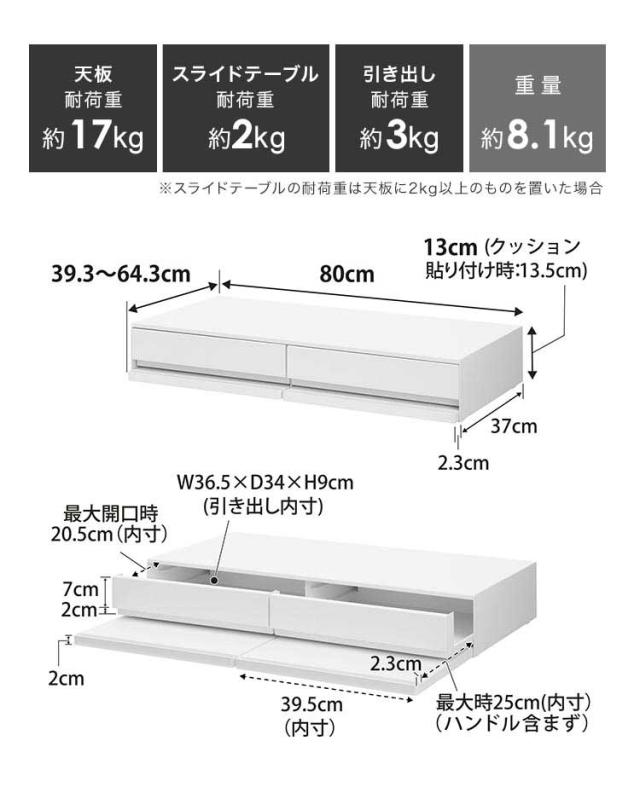 外寸:約 H13.5×W80×D39.3〜64.3cm