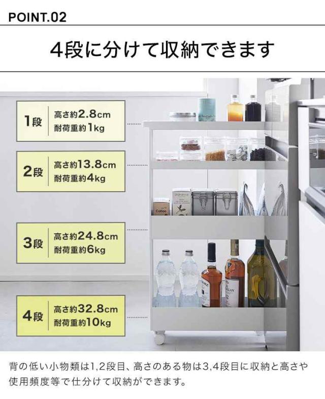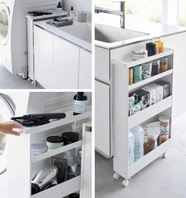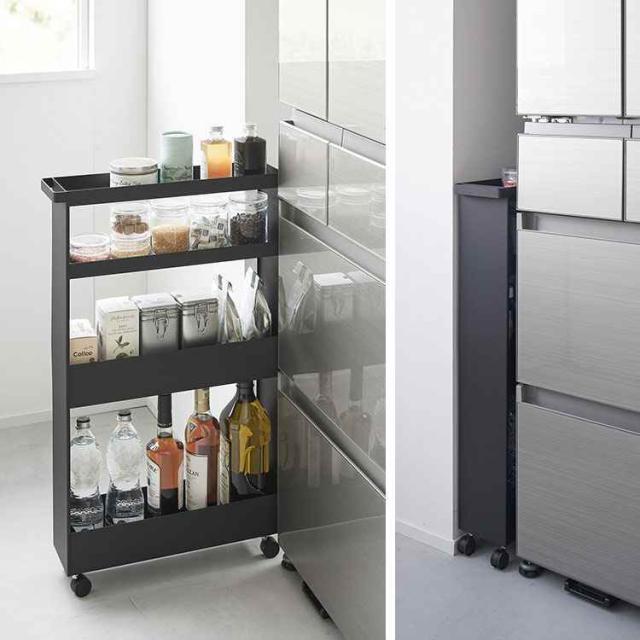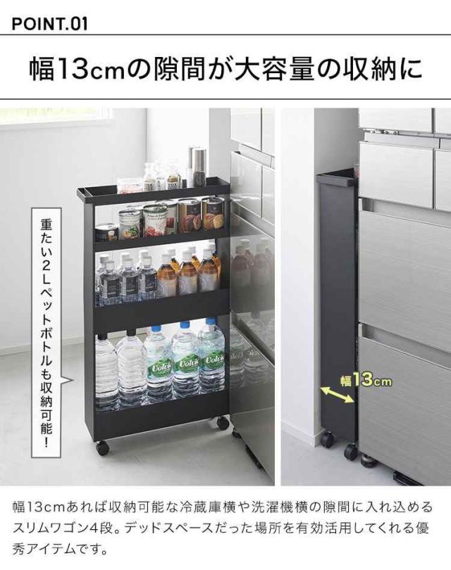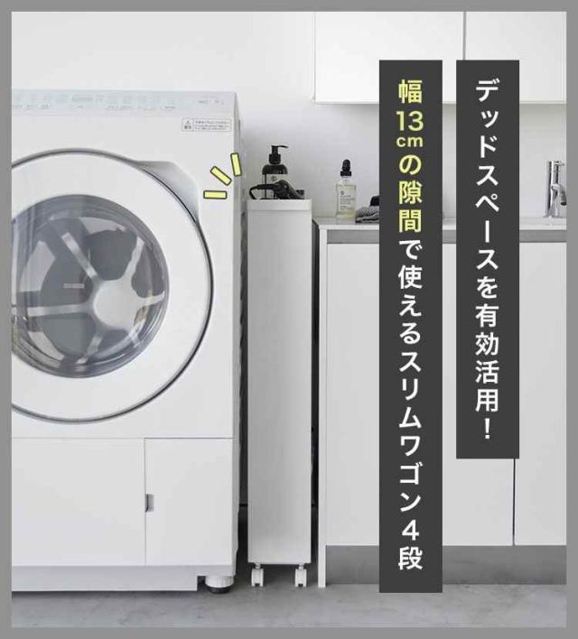 幅13cmの隙間で使えるハンドル付きのスリムワゴン4段!隙間に収まり見た目もスッキリ。ハンドルや回転するキャスター付きなので移動や掃除がしやすいです。キッチン小物、ジャムや雑貨などの小さい物からペットボトルや瓶類などの大きい物まで、冷蔵庫横などの省スペースに収納できます。ランドリルームでは、洗面台周りの小物から洗濯洗剤などの大きい物まで、洗濯機や洗面台横の隙間に収納できます。