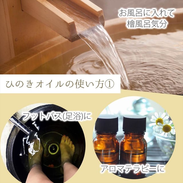| 説明 | 100%天然精油(エッセンシャルオイル)の国産ひのきオイル。 日本人に馴染深い、紀州の檜の精油です。 気持ちを落ち着かせるような安心できる香りが特徴。 まるで森林浴をしているようなリッラクスできる香りが楽しめます。 睡眠時のリラックス用やお風呂の香り付けとしてもとても人気が高い香りです。 また防虫効果もありますので、虫よけ対策としても利用できます。 |