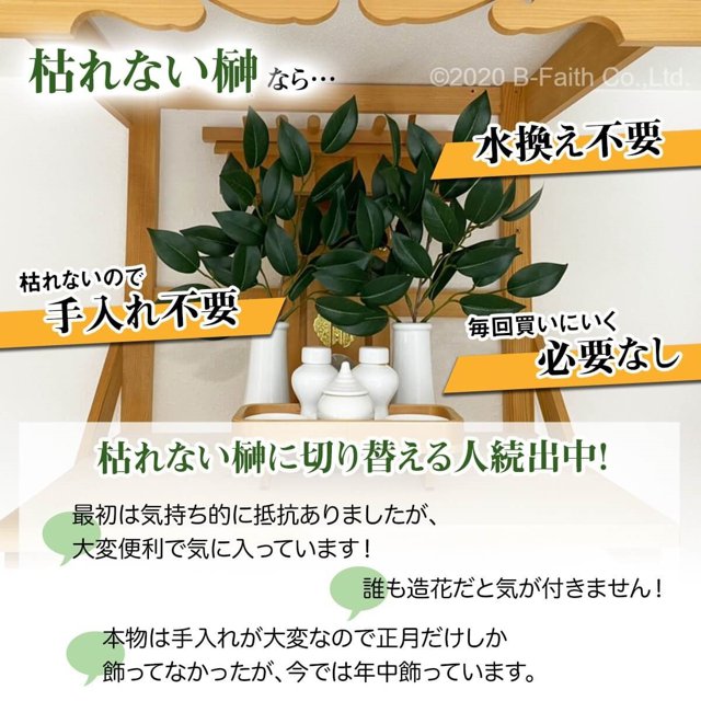 - すぐに届きました 神棚が輝いて見えます。毎週サカキを交換していたので枯れないのは良いです つやも良くて造花には見えないですね