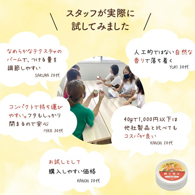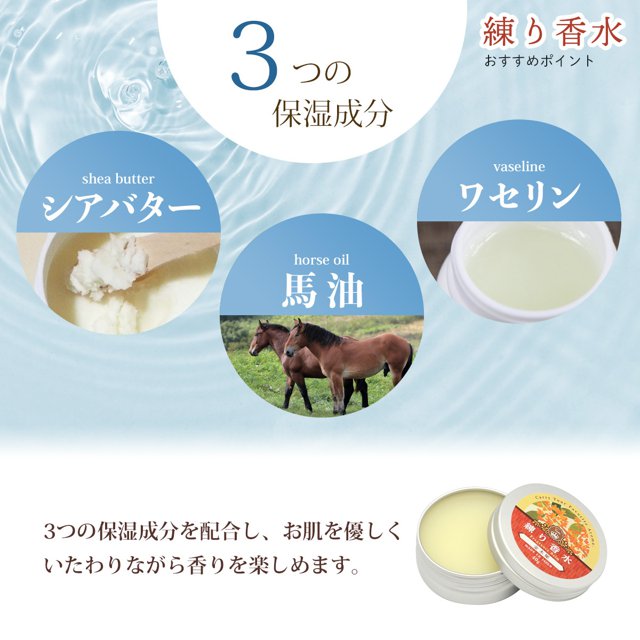 | 特徴 | 純粋なジャスミンの香りの練香水(ハンド・ボディクリーム)です。 シアバター、馬油、ワセリン配合で滑らかなテクスチャーと高い保湿力も実現。 程良く柔らかな香りの強さで、きつすぎる香水が苦手な方にお勧めです。 通常の液体香水はアルコールが高配合されているものが多いですが、こちらはほぼ全て保湿成分のみで作られているため、お肌の保湿と共にジャスミンの香りを楽しむことができます。 厳正な品質管理の元、日本の工場で製造していますので、安心してご使用ください。 |