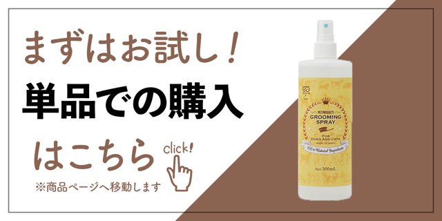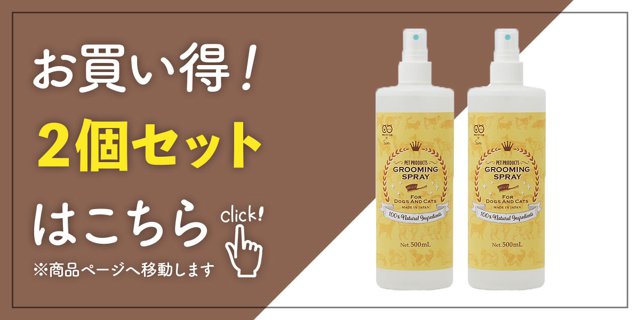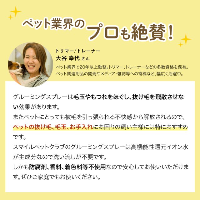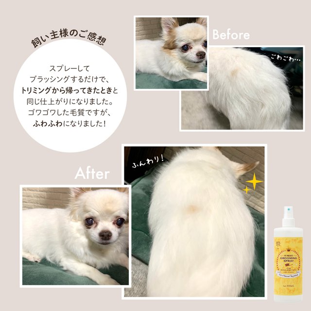 | 説明 | スプレーをしてブラッシングをするだけでサラツヤでフワフワの毛並みに変身! 皮脂汚れを溶かして分解し、毛のキューティクルを傷めずに汚れを取り除きます。 シャンプーやトリートメントとは違い洗い流す必要が無いので毎日お手軽にご使用頂けます。 人にも使用できるグレードの成分を使用していますので、使用する方の肌荒れのリスクも軽減。 成分そのものに除菌効果があるので、防腐剤も不使用。もちろんノンアルコールです。 |